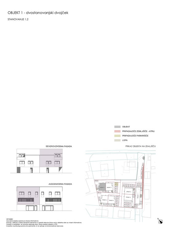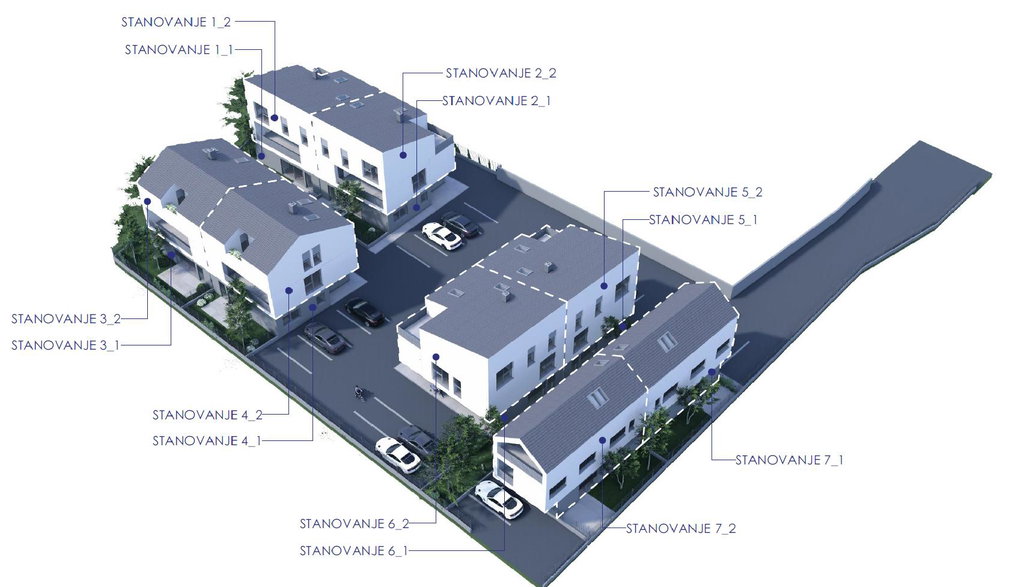 Stanovanja so v pritličju in duplexu. Vsakemu stanovanju pripadata še dva lastniška parkirna mesta pred stavbo (nadstrešek) z električno vtičnico.