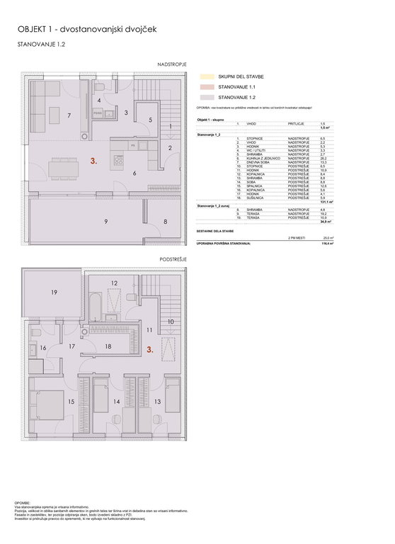 Prodamo 4 sobno duplex stanovanje v bruto izmeri 166 m2, od tega stanovanjske površine 131,10 m2 + shramba 4,80 m2 in dve terasi v skupni izmeri 30,10 m2.