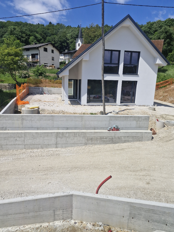 Fasada bo v beli barvi, 20 cm izolacija – stiropor, 3 slojna okna z električnimi žaluzijami antracit sive barve. Okolica bo delno asfaltirana, tlakovani pločniki okoli hiše, podporni zid.