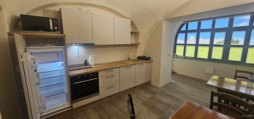 Kuhinja je opremljena z hladilnikom, štedilnikom, pomivalnim stroje z vsem drobnim inventarjem (novo).
