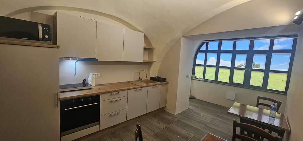 Kuhinja je opremljena z hladilnikom, štedilnikom, pomivalnim stroje z vsem drobnim inventarjem (novo).