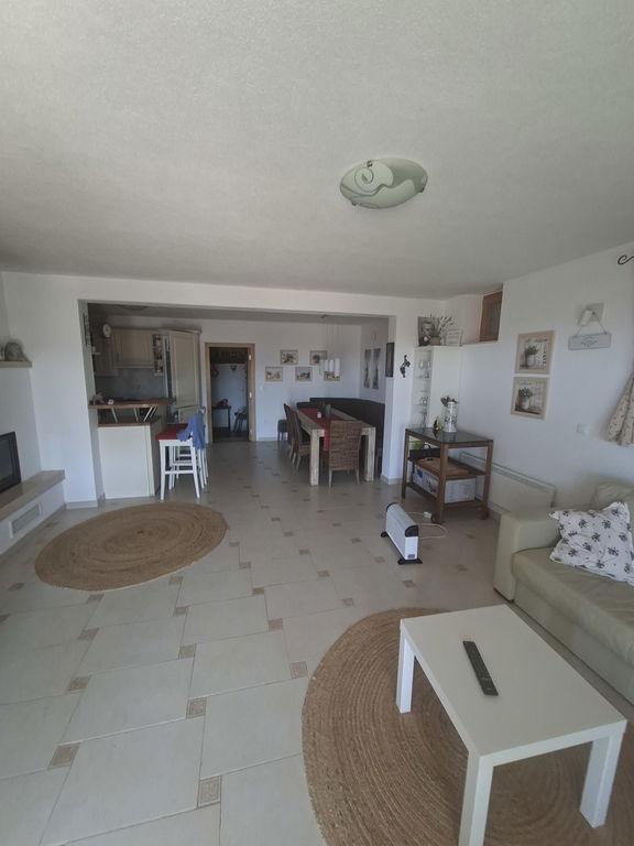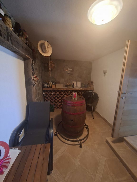 Prva etaža vsebuje: bivalni del (kamin) z kuhinjo in jedilnico z izhodom v atrij, kateri je pokrit z nadstreškom, shramba, klet, kopalnica.